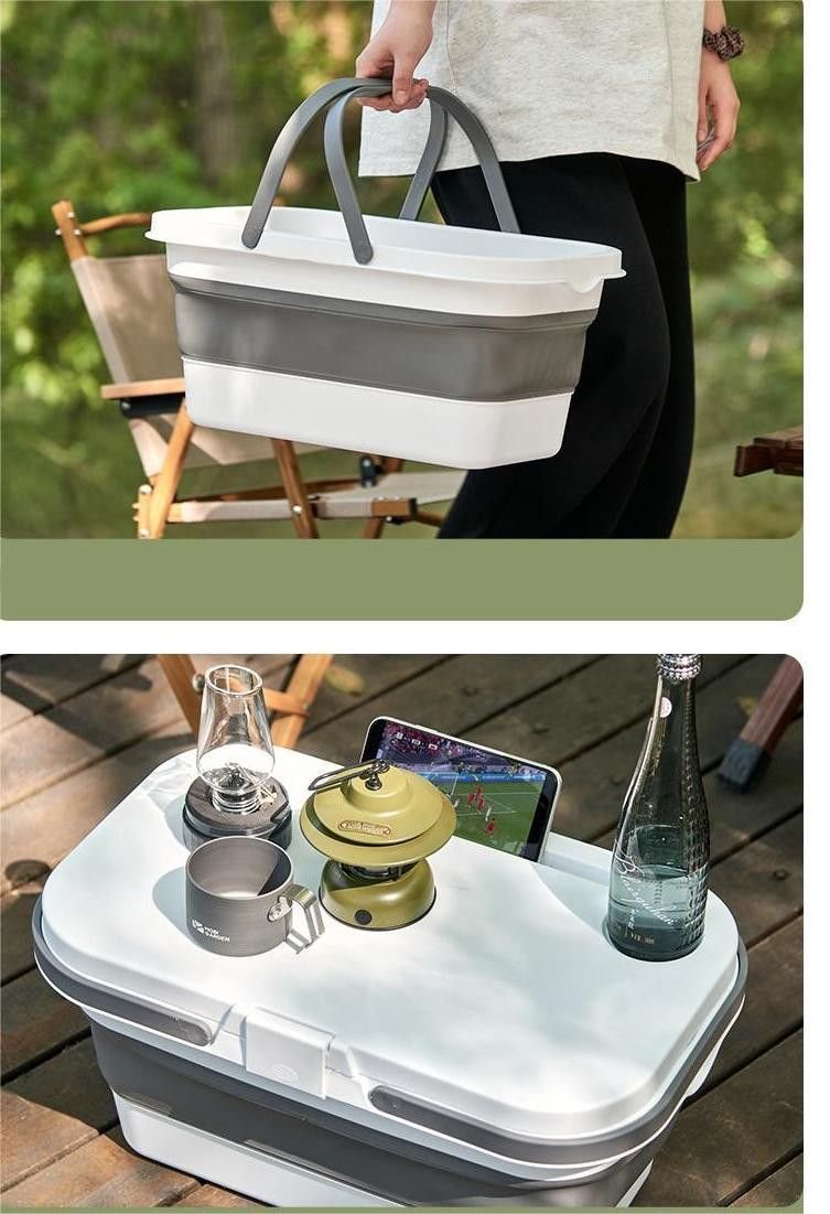 This is an outdoor camping folding storage box picnic waterproof picnic basket.Material: PP + TPRColor: Gray, coffee colorSize: 46.5 * 22.7 * 23.51. Folding does not take up space2. Multiple uses